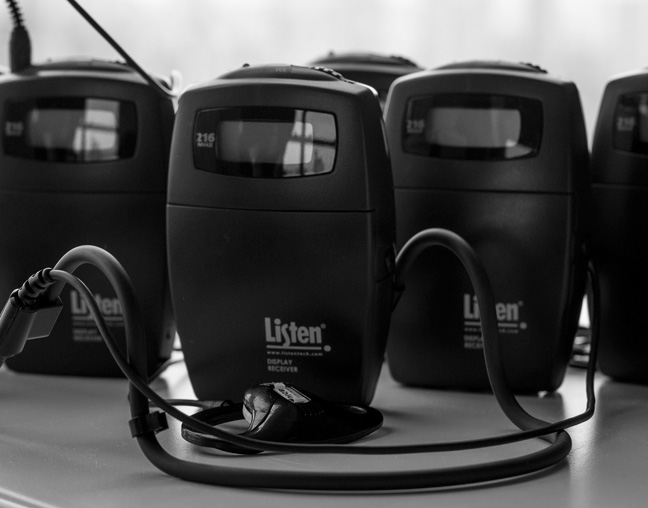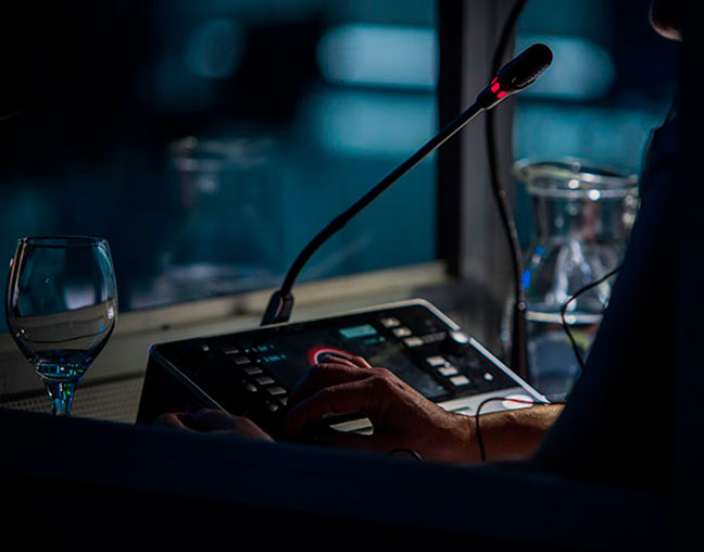 Infraestrutura estacionária com uma ou mais cabines ou meia-cabines, de acordo com o número de idiomas desejado, transmissores, mesa de som, central de intérpretes, microfones, headsets e receptores para os presentes (opcional). Além do técnico de som que sempre acompanha o evento do início ao fim, para conferências presenciais oferecemos recepcionistas bilíngues, acima de 50 participantes (opcional).
